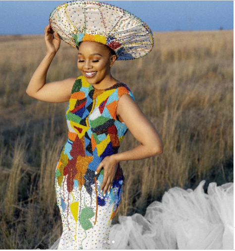 A beautiful Zulu wedding dress by Bayanda Khathini, featuring intricate beadwork and elegant traditional designs for a stunning bridal look.
