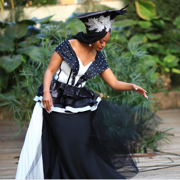 Celebrate heritage and elegance with the Black and White Xhosa Wedding Dress by Antherline Couture. This exquisite gown combines classic Xhosa-inspired patterns with a contemporary bridal silhouette, creating a look that is both timeless and sophisticated.