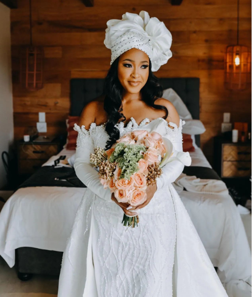Exude elegance and cultural pride on your special day with the Drop Shoulder Xhosa Wedding Dress with Doek by Asanda Madyibi. This stunning gown beautifully fuses traditional Xhosa elements with contemporary bridal design, creating a look that is both sophisticated and deeply meaningful.